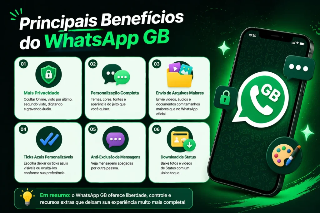 O WhatsApp GB oferece recursos extras que melhoram privacidade, personalização e experiência de mensagens, tornando o aplicativo mais flexível.